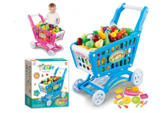 Kupředu na na nákupy... Nákupní vozík s kuchyňskou sadou. Balení obsahuje nákupní vozík, 24ks ovoce a zeleniny, varnou desku, jeden hrnec, jednu pánvičku, dva talířky, desku na krájení, nožík, vidličku, obracečku, žufánek a dva tácky. Nevhodné pro děti do 3 let.