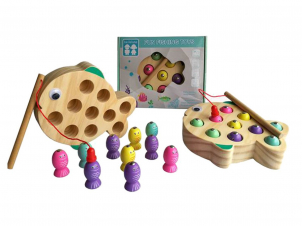 Rybo, rybko, rybičko, počkej na mě maličko. Dřevěný rybolov s deseti barenými rybičkami na magnet.