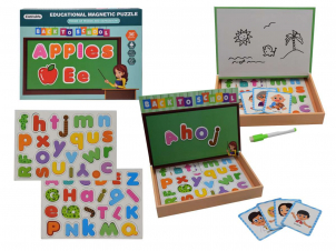 Spoznávaj písmenká veselou formou. Balenie obsahuje - úložný box, obojstrannú magnetickú tabuľku (z jednej strany môžeš písať priloženou fixou a z druhej pomocou magnetu skladáš slová), dva magnetické pláty s písmenkami a 4ks obojstranných kartičiek. Nevhodné pre deti do 3 rokov.
