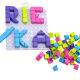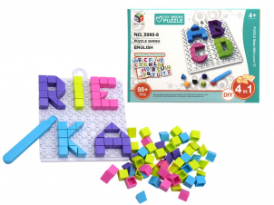 Rozvíjaj detskú predstavivosť a jemnú motoriku. Vyskladajte si jednoduché slová. Balenie obsahuje farebné kocky a trojuholníky, oddeľovač, hraciu plochu a návod na písmenká. Nevhodné pre deti do 3 rokov.
